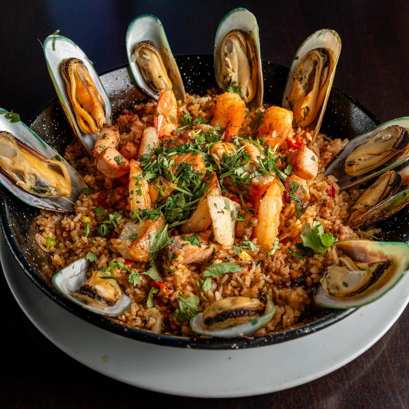 Salmon, shrimp, chorizo, mussels, market fish, roasted peppers, peas, micro cilantro.